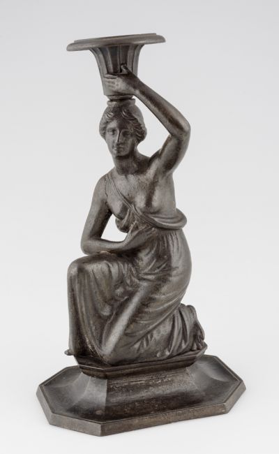 The most frequent type of candlesticks made in Munkacs. Two variants are known they differ in the shaping of the plinth and the kneeling female figure. The plinth with eight sides supports a female figure, bending on one knee, dressed in a loose gown, with naked breasts. She leans on her leg with the right hand, while with her left she holds the rimmed candle socket, placed on her head, marked with cast majuscules on the bottom of the plinth: MUNKATS.