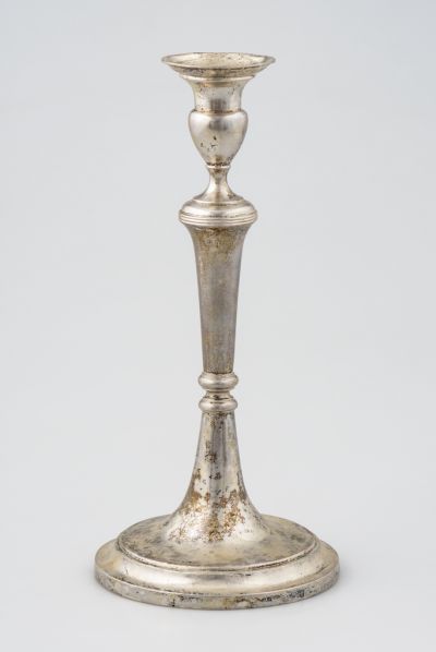 The urn-shaped socket of a rising, protruding candle ring is supported by a baluster stem, which stands on a round foot with a jointed rim. Marked with the town mark of Rimaszombat and the contemporary maker's mark of Jozsef Szent-peteri, impressed on the foot.