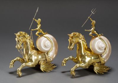 The endless imagination exhibited by metalwork of this period bears witness to the Mannerists’ interest in mythology and curiosities. The princely and noble owners of Kunstkammern, or collections of “curiosities and wonders”, especially valued those works in which outstanding artistic quality and precious metals were combined with unusual materials. Elias Geyer (active 1589, †1634), the renowned master from Leipzig, strove to achieve this melding in his brilliantly executed table ornaments. The ancient source of the composition is certainly a detail from the second book of the Aeneid, in which Neptune raises his hand and quiets the roaring sea. The hind part of the anatomically correct “seahorses” extends into an exotic sea shell, while the ornate fins on either side signify that these are mythical sea creatures. At the top of the seashells (the tail of the animals) the disproportionately small, naked figure of Neptune, the powerful sea god, appears as the driver of the mythical sea creatures. In his right hand we see his recognized attribute, the trident, while his left hand grasps the reins made of chains (inv. no. 18899) The heads of the horses can be lowered, a reminder of the function of the two pieces as vessels for storing valuable beverages at the lavishly set royal dinner tables. The Grunes Gewolbe in Dresden preserves another five works by the Leipzig master analogous to these two works (one bearing an identical mark to the Budapest pieces, the other four unmarked). In the Dresden horses their prancing postures are supported by posts affixed to their bellies. In the Budapest pieces, the openings on the horses’ abdomen where supports would have been placed were later sealed.