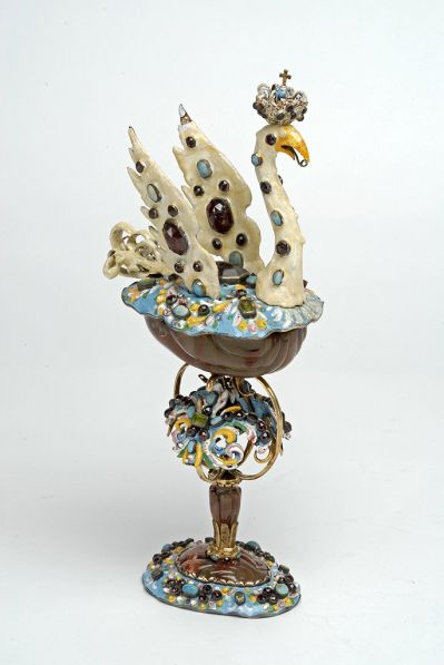 This ornamental vessel has a base and superstructure richly decorated with enamel and gemstones, a polished jasper cup that resembles a scallop shell or a segmented fruit, and an enamelled, gem-studded lid in the shape of a crowned swan. The base of the foot is an ovoid, embossed metal plate with a light blue enamel ground, which holds, in a mount, a scallop-shaped piece of jasper. The light blue ground around the latter bears slightly plastic leaves and flowers, created by patches of white, yellow, blue and reddish enamel, and turquoise, garnet and chrysolite stones in mounts. The joint of the ribbed jasper stem and the foot is concealed by a hoop decorated with turquoise and garnet. The C-shaped and hidden curved supports that rise from the gilded, ring-shaped end cap of the stem hold enamelled leafy appliqués, before merging in another ring at the base of the jasper cup.
