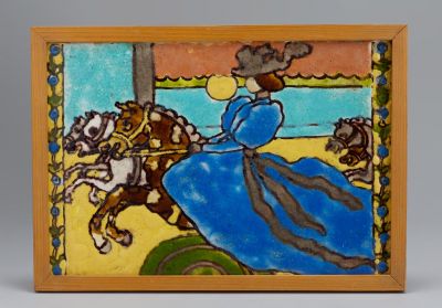 The factory-made tile was cut to the size required by the composition. On the front the picture is painted with thick, domed glaze patches the indented, dark contours prevent the colours running into each other. This technical solution reminds us of cloisonne enamel and is in harmony with the artistic principle "cloisonnisme". The use of the brown contours - called "round contours" by Rippl-Rónai - , with the applied clear, vivid, complementary yellow-ultramarine and ochre-turquoise colours, the natural grays and browns were typical of tapestries designed by Rippl-Rónai. In this picture, a young lady in a feathered hat sits on the carousel horse, with her belt and long skirt flapping behind her. The picture is decorated with a flower border on the two shorter sides. In the background, there is the canvas of the circus jiut, while the bottom edge shows the plinth of the carousel, with simple, suggestive geometrical shapes. The picture evokes the sense of peacefulness and motion. The ftappy, playful topic, the carousel and the female figure already predicts the symbolist interpretation of the rotation of life. Rippl-Rónai, who was always able to keep the naturalness of the experience and the deep symbolic meaning in balance, was deeply involved in this question. He planned to issue a coloured drawing series with the "Carousel" title in the "Insel" magazine of O. J. Bierbaum, but the magazine ceased publication. The pencil sketch of the ceramic picture is now in the Hungarian National Gallery (Inv.No. 1911-326). Unfortunately, there is no further information as to the identity of the workshop, except for the name written later on the object. It was produced probably in connection with André Matthey's activity, because he is named as the maker of ceramic designs prepared by the painters of the Nabis group by Ambroise Wollard. There is further reference of a connection between Matthey and Rippl-Rónai in the fact, that among the plates made by Matthey there are some decorated with typical motifs of Rippl-Rónai. The Nabis artist group and their early association with Matthey (1895-1900) also apparently ties the wall fountains of Aristide Maillol, the ceramics of Pierre Bonnard and, most significantly, the tile pictures of Kerr-Xavier Roussel and Maurice Denis together. In 1897, at the exhibition of Siegfried Bing's Art Noveau Salon, Rippl-Rónai introduced some of his “majolica decorations”, including probably the piece described above.