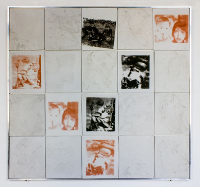 The composition consists of 20 oblong porcelain plates, in a matrix of 5 × 4. Some of them bear images, transferred with a photographic process and then fired on the plates in black-and-white and iron-red tones: portraits of infants and children, and a mother and her one- or two-year-old son, looking into the camera. The rest of the plates show impressions made by crumpled children’s clothing pressed into the unfired porcelain mass. Twenty selected or randomly chosen pictures from the life of a woman, an artist, ceramist Ildikó Polgár, framed and arranged, as if in a photo album.