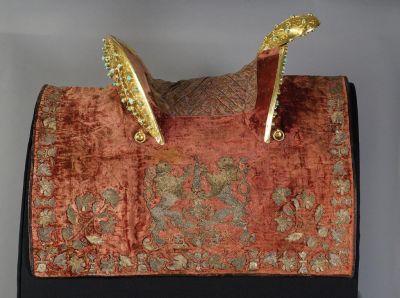 Materials: | cut-pile velvet; silver-gilt; turquoise; wooden frame |