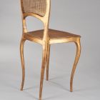 The chairs stand on four slim, cabriole legs. The narrow, plain seat rail supports the caned, trapezoid seat. The back legs are continued in the back support, which is lying, pear-shaped. The wooden parts of the chair are painted in gold. The chairs once belonged to the furniture of Judge Kornél Emmer's Budapest palace under 14 Fő Street (see Archives Department of the Budapest Museum of Applied Arts, Fit: 5894, 6048).