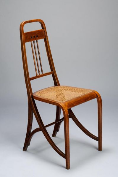 The front legs and the seat rail are made of one bent, square rod. The stretchers start from the front legs and are continued in the back support, also bent of one single piece. The back legs, connected by a straight stretcher, are joined to the main stretchers at the level of the seat and also at the bottom, with a small, curved rod. Three small rods create the back support, starting from a horizontal rod, leading up to the wide top lathe that is decorated with three holes. The seat is caned. There is a paper note in German glued to the seat rail, with the Thonet mark.