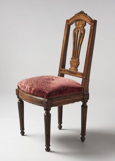 The four splayed, fluted, cylindrical legs support a trapezoid seat. The seat-rail is slightly bowed at the front, and decorated with a rosette at the juncture of the legs. The back-support is a pierced, rectangular frame, the top of which is slightly curved. It is filled by a pierced vase motif, which is divided into three parts, showing a leaf at the top. Its upholstery and cover is newer.