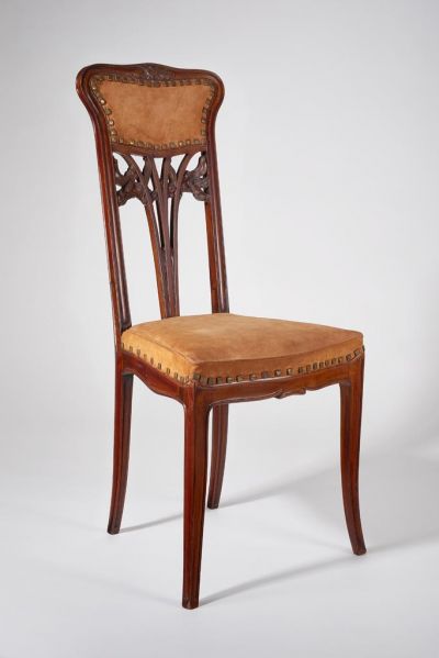The chair stands on four curved, edged, prismatic legs. The sides of the trapezoid seat are wavy, curved. The middle part of the back support is divided into four rods, carved with pierced flowers. The curved, widening top is upholstered in leather. Marked with a stencilled note in ink, on the bottom of the seat upholstery: «Schmidt Miksa / Budapest / V. Lipót Körut 3,4,6 Rudolf - tér 2 / Báthory utcza 3. / Friedrich Otto Schmidt / Wien».