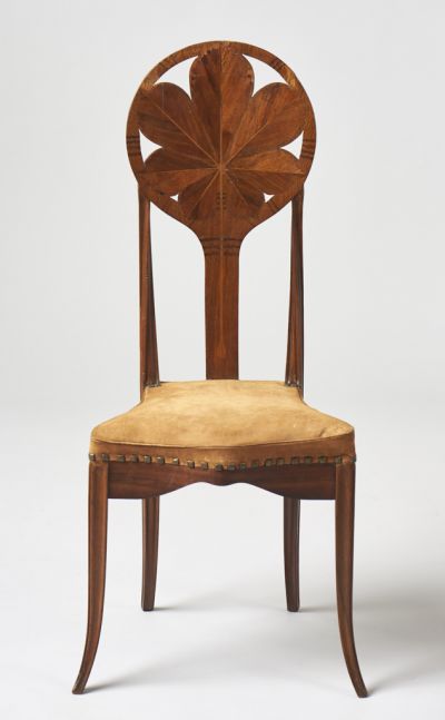 The chair stands on four curved, fluted prismatic legs. The sides of the trapezoid seat are wavy, curved, just like the bottom of the seat rail. The semicircular top of the back support is decorated with pierced, inlaid chestnut leaves, arranged in a circle. Marked on the bottom of the seat upholstery with a stencilled note in ink: « Schmidt Miksa / Budapest / V. Lipót Körut 3,4,6 Rudolf - tér 2 / Báthory utcza 3. / Friedrich Otto Schmidt / Wien». There is also a metal plate nailed to the rail with «Techn. Atelier für Wohnungs-Einrichtung FRIEDRICH OTTO SCHMIDT / I. Singerstr. 16 Wien IX: Waisenhausg. 7./ Palais Ratibor-Breunner Telegr. Adr.: TIMISCH WIEN Telephon 7760 / BUDAPEST Schmidt Miksa Lipót körut 32».
