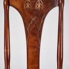 The chair stands on two cylindrical leg, resting on buns at the front and two prismatic ones at the back. The trapezoid seat is upholstered in stitched-down leather. The back support is pierced, curved, the tapering middle support is decorated with two vertical, stylised tulips. The same tulips appear on L. Majorelle's dining-room cupboard, exhibited at the 1898 Paris Salon. This chair belonged to a dining- room suite. The picture of a similarly shaped and decorated piece is published in Decorative Kunst, Vol. 2, 1898 Heft. IX, p.129, and Soulier 1898 p.10.