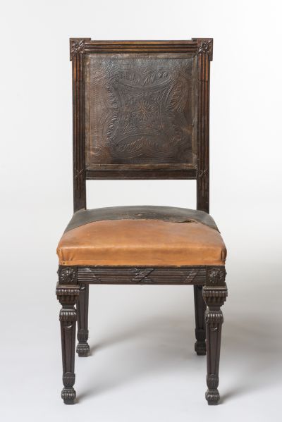 The chairs stand on splayed, prismatic legs. The seat-rail is carved with plaits of ribbons. The rectangular back-support is lined with carved flutes, while the corners, as well as the junctures of the legs and seat, are decorated with carved rosettes in squares. Upholstered seat and back.