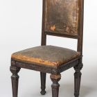 The chairs stand on splayed, prismatic legs. The seat-rail is carved with plaits of ribbons. The rectangular back-support is lined with carved flutes, while the corners, as well as the junctures of the legs and seat, are decorated with carved rosettes in squares. Upholstered seat and back.