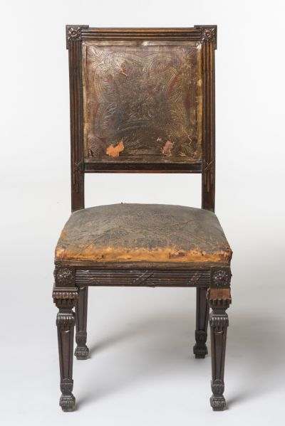 The chairs stand on splayed, prismatic legs. The seat-rail is carved with plaits of ribbons. The rectangular back-support is lined with carved flutes, while the corners, as well as the junctures of the legs and seat, are decorated with carved rosettes in squares. Upholstered seat and back.