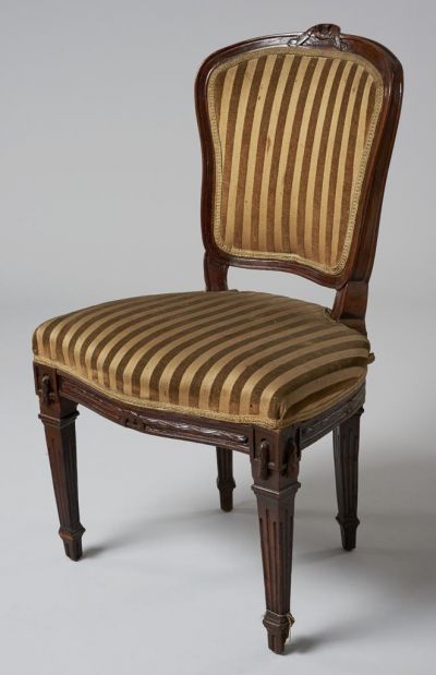 The chair stands on four splayed, prismatic legs with cannelures. Its seat is trapezoid the seat-rail has a slightly wavy shape at the front. The back is splayed, its sides curved and bent. Its top is also curved with a carved garland in the middle. Both the back and the seat are upholstered.