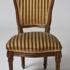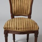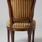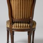 The chair stands on four splayed, prismatic legs with cannelures. Its seat is trapezoid  the seat-rail has a slightly wavy shape at the front. The back is splayed, its sides curved and bent. Its top is also curved with a carved garland in the middle. Both the back and the seat are upholstered.