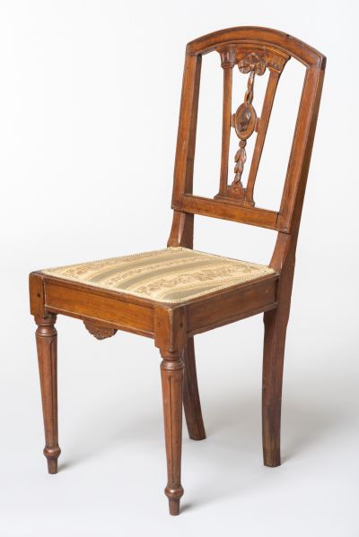 The splayed, cylindrical, fluted legs of lathe- turned tops have shoes. The seat is trapezoid the front of the seat-rail is carved. The back is a pierced square, with a slightly curving top. It is carved with ribbon between two curved laths, showing a carved medallion of a Turkish male head wearing a turban, in the middle.
