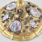 The base of this chalice is divided into six ogee-arched lobes, and is decorated with repoussé floral, shell, and scale motifs. There are also three cartouches that hold enamel paintings with undulating edges similar to a sexfoil shape. Glass gemstones of differing colors, enamel flowers of varying shapes and colors, and three enamel angels have been mounted between the paintings. The upper, stem-like section of the base is covered in three motifs comprised of snail shells and leaves. The chalice’s asymmetrical node is composed of rocaille and volute decorations and rests on a small sphere. The calix of the chalice has repoussé motifs similar to those on the base and holds four enamel paintings with rounded corners. Between these paintings there are enamel angels sitting under baldachins as well as glass gemstones and flowers. The ornamental enamels have been heavily damaged in several places.