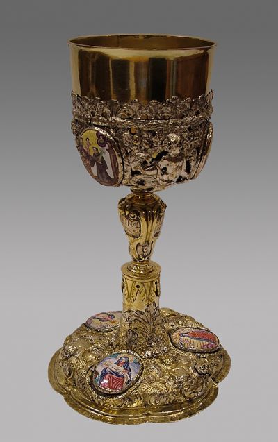 The relief surface of the sexfoil base of this chalice is embossed. Three children (angels) kneel amongst acanthus leaves with three oval enamel paintings inserted separately amongst them framed by leaves. Hanging acanthus leaves decorate the tapered cylindrical stem-like section of the upper base under the collar. Its node is in the form of a vase with three gilded cartouches in scrollwork frames, upon which there is an engraved inscription, “BOGYO / IVLIANA // CSINAL/TaTa // 1699 / ESZT” (“Ivliana Bogyo had this made 1699”). The calix is adorned with putti amongst the openwork, embossed acanthuses as well as three enamel paintings placed similarly to those on the base. At its top, there is a wreath of leaves in relief with acanthus leaf crenellation. The bowl of the cup is gilded in contrast to the calix, and its lip flares slightly outward. The master’s mark (HAS) struck into the edge of the base can be clearly seen, while the second stamp is hard to read.