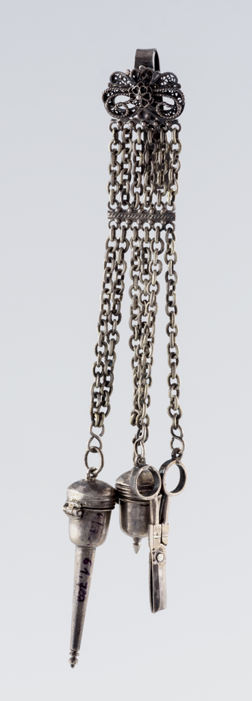 This is a historicizing version of a seventeenth century accessory that was usually worn suspended on the belt. The suspender plate is bent, with a filigree rosette below, from which the six chain plaits start. The chains are gathered with a small plate at the top. They are connected in pairs, suspending a pair of scissors, an acorn-shaped yarn case and a baluster-shaped needle case.