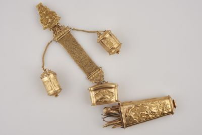 The hook of the chatelaine chain is decorated with a lady's half-length portrait in a medallion. A broad, plaited, ribbon-like chain joins the hook, with a necessaire case and two simple chains hanging below. The side chains hold a thimble case and a scent bottle. The flat, slightly splayed, prismatic case of the necessaire has a cover that opens on a hinge. One side of the case depicts a lady playing the guitar, while on the other we can see a man playing the flute — both framed by a cartouche. The cover is decorated with music instruments and landscapes in a rich framework. The case hides an earpick, a tootpick, a needle holder, a penknife, a pair of scissors and a threading needle. The covers of the thimble case and the scent bottle also open on hinges. Each of their swelling sides is decorated with four small landscape pictures.