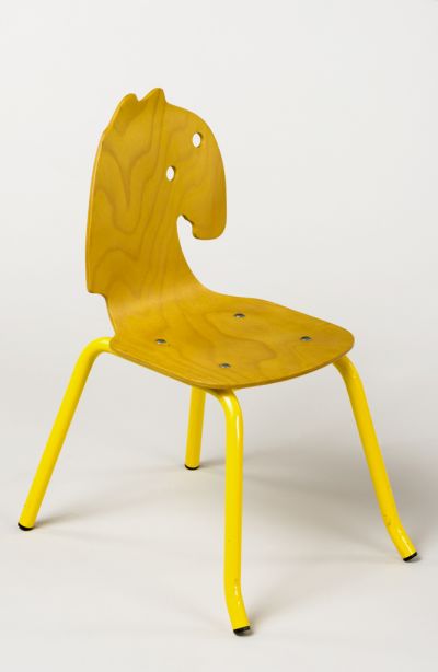 The series of chairs designed for use in kindergartens—and the accompanying cloud-shaped children’s table—follows Balázs Pálmai’s earlier, animal-shaped furniture-cum-sculptures (‘Shark Bench,’ ‘Chicken Chair’), but includes simpler solutions, facilitating mass production. The seat and back of the chairs are made of a single piece of plywood, bent and painted in different colours. The outlines of the backrests are in the shape of stylized animal heads, reminiscent of children’s toys, including a rabbit, a pig, a calf, a cat, a horse, and an elephant.