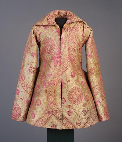 The mente – a kind of overcoat – was a typical piece of the Hungarian noblemen’s outfit worn over the dolman in the 16th–17th century. The mente surviving in the Esterházy collection was probably worn by a boy at the age of about 10 years. The cut adopts the pattern of Turkish kaftans. At the hips it is widened by inserts. The long sleeves (“pipe-sleeves”) reaching down to the bottom of the garment are only for decoration the arms were stuck through the openings at the shoulders. There is a broad turned-down collar. The fabric is one of the most finely and proportionately patterned specimens of the most expensive Turkish court silk lampas fabrics (kemha) interwoven with gold and silver threads. The pattern is in the 75 “four-flower” style typical of the Turkish cloths of the period, comprising lines of mandorlas including carnation, rose, tulip and lotus flower. The child’s mente was probably retailored from another garment, as the collar of several pieces and the slightly askance direction of the pattern on the back suggest. Sources reveal that using clothes of valuable fabrics – this time perhaps a Turkish gala kaftan (hil’at) received as a gift – were used for skirts, mente lining, children’s attire or ecclesiastic vestments. Tradition has it that the mente was worn by archbishop of Esztergom Miklós Olah (1493–1568), but recent researches prove that the fabric was produced in the second half of the 16th century the earliest, so the archbishop could not wear it in his childhood. It was probably to enhance the magnificence of the family that the Esterházy’s associated the garment with this notable personage of the past.