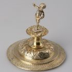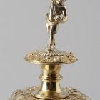 Round base, with a vase-shaped node. The broad rim is decorated with etched arabesques. The finial of the cover is a standing putto.