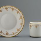 The cup is cylindrical, with a curved, cornered handle that joins the body horizontally. The saucer has a splaying rim. The rim of the extremely thin, transparent pieces is lined with repeated motifs of tiny gilt, stylized chrysanthemum bunches. The rim and the handle are gilt.