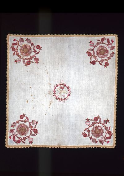 The corner-motifs are the work of a professional embroiderer. The drawing of these and the geometric pattering of certain flowers both attest to outstanding ability. The central garland is the work of different, unsophisticated hands. In all probability it was sewn onto a handkerchief made somewhat earlier, when the piece was selected as a gif to a church.