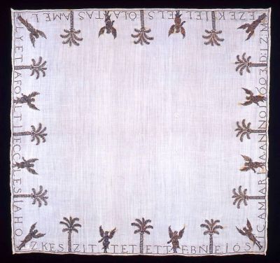 The border of the cloth is decorated with alternating motifs of cherubs and palm trees, with inscriptions between them: “First dream of Ezekiel made by Mária Josica in 1693 for the Church in Folt.” Nothing similar has been found in Hungarian embroidery, although the technique of satin- stitch with a geometrical pattern was very common in Hungarian domestic needlework.