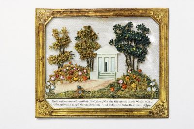There is a building with a tympanum and a portico (probably the church of friendship and harmony), placed in a shady park, enriched with bright flowers (roses, forget-me-nots, tulips), standing on a high plinth. Stairs lead up to the entrance. There is an inscription at the bottom: Froh und wonnevoll verfliess Ihr Leben, Wie ein Silberbach durch Wiesengün, / Gotterfreude möge Sie umschweben, Und auf jedem Schritte Rosen blüh'n. I. E. The metal frame is simply joined, with stylised, symmetrical ornaments in the corners. The flowers with symbolic meaning reflect the sentimentality of Biedermeier taste the building itself demonstrates the survival of Classicist taste. Such buildings were popular motifs for congratulation cards, especially among the Kunstbillets of Endletzberger and his followers. Endletzberger was a qualified engraver he became the most famous master of the collage-like, meticulously prepared Wiener Kunstbillet, composed of various materials.