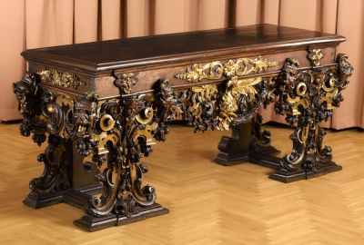 The front legs are pierced, and carved with masks, angel heads, leaves and clusters of fruit in relief. The back legs are plain. The apron of the table is decorated with a gilded eagle in a pierced bay-wreath. The top is rectangular.