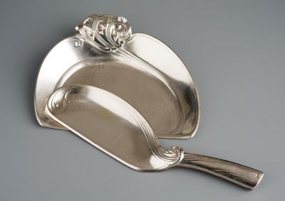 All pieces are decorated with identical, embossed floral motifs: twined foliage with relief nervure. The handle of the crumb shovel is pierced, semicircular, enriched with three bird figures among the tendrils. The illustration of two pieces of the set is published in Revue des Arts Decoratifs Vol. 16, 1896, p.130.