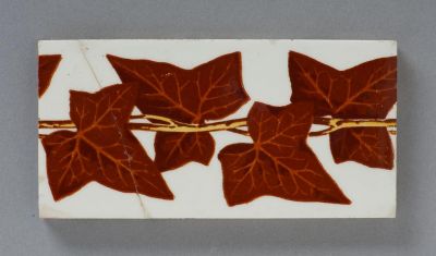 The lying rectangular tiles create a bordering decoration of continuous ivy leaves, identical on each tile. The central stem has two leaves bending to both sides. The nervure is marked with light brown on the dark brown leaves, against a white base. The leaves are shaded with a few spots. The central stem is coloured in lighter yellow at places.