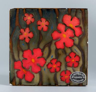The three small, square tiles are decorated with identical patter: two larger and three smaller flower heads with five petals, placed diagonally over the split stems. Due to reduction-firing the red flowers, the brownish stems and the golden green background show different shades on each tile. Décor number 4892, with no remarks in the Décor Book.