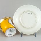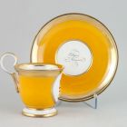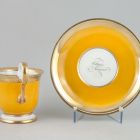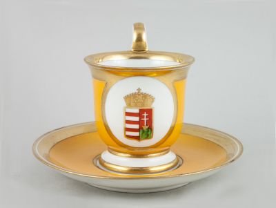 The bell-shaped cup of a rising, paw handle stands on a narrow foot. The plain saucer has a curved side. The outside of the cup and the surface of the saucer are yellow. Opposite the handle, the cup is decorated with the Hungarian coat of arms, with a crown, in polychrome painting over a round, white field, framed with gold. The middle of the saucer shows an inscription in cursive, placed in a round, white field, framed with gold: Éllyen / a Nemzet! the handle of the cup and the rims are gilt.