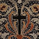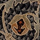The top, straight edge of the lace shows the inscription SZT. ISTVÁN. Below, the symmetrical pattern is repeated twice: a cross of metal thread among curved leaves, its horizontal stem surmounted by coiling stems that end in rose buds. Above the cross, the Holy Spirit is pictured in the shape of a dove. It was probably designed for the trimming of an altar cloth however, we have no further information supporting this supposition.