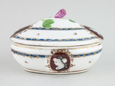The pear-shaped, moulded finial of the cover is painted red. The surface of the oval bowl is deco-rated with a purple medallion, enclosed by a gold wreath, on each side. One of the medallions depicts a portrait of a woman in a headdress, while the other shows the bust of a man in a top hat, both painted in gray. The bottom and the inner rim are lined with blue. The decoration of the cover is similar to that of the bowl. Marked with the marking of the Vienna manufacture and the impressed date: 802.