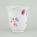 A splayed cup for coffee or chocolate, with a handle forming a question mark. The inside of the saucer is equipped with a raised, pierced ring to hold the cup. The cup is decorated with a purple bunch of flowers and scattered isolated flowers, the saucer with a bunch of roses.
