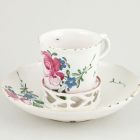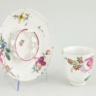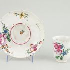 A splayed cup for coffee or chocolate, with a handle formed as a question mark. The surface of the saucer is supplied with a pierced ring to hold the cup. Both pieces are decorated with bunches of roses and small scattered flowers in purple, green, blue, yellow and iron-red. Marked on the bottom with an L in black.