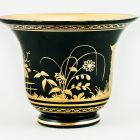The cylindrical bowl is splayed like a cornet at the top it is supported by a short foot, which is decorated with a gilt, horizontal line. The surface of the cup shows chinoiserie motifs: a Chinese figure standing under a tree in a garden, holding a rod, with a flying dragon above him and a scenery with rocks, sedge, a pagoda and flying birds on the other side. The bottom and the top rim of the bowl show a lattice-work decoration of symmetrical stars, between two framing lines. The whole surface of the inside is gilt some stripes below the rim are left black, showing flowery boughs.