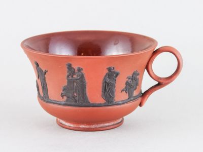The dark red, bulging cup has a slightly splayed top rim its handle joins the top rim with an oval ring. The surface is decorated with black, embossed, separated motifs of female figures wearing peplos, a woman with a torch, an olive with a putto beside it, a dog, a male figure holding an olive branch, and a basket. The inside of the cup is glazed. There is an impressed „WEDGWOOD” marking and an impressed „D" on the foot. The broad, flat saucer has a curved rim, lined with embossed black acanthus leaves on the inside. Marked with an impressed „WEDGWOOD” marking. This type of cup and saucer is published in the 1817 catalogue of the Wedgwood factory, with type number 1621.