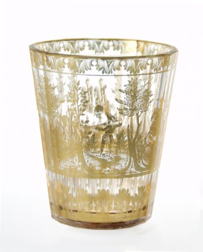 A slightly splayed, cylindrical glass, faceted into twenty sides outside. It is decorated with a hunting scene in a landscape, etched with gold foil: a pack of hounds chase deer, and a hunter fires at one. The scene is placed between two lines of acanthus leaves. The bottom shows a man on horseback, blowing a horn, etched with gold foil, against a red lacquer background.