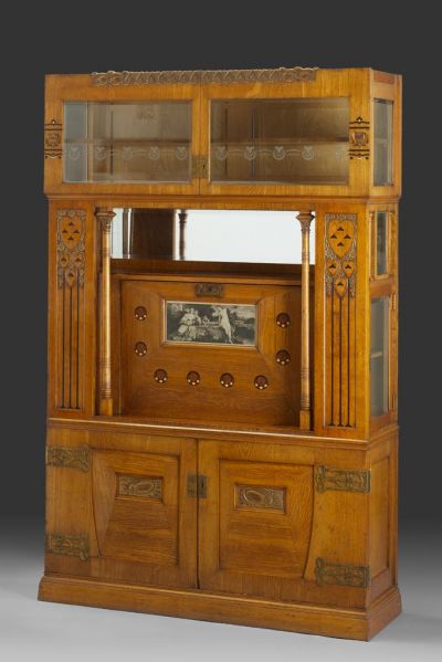 The lying, prismatic bottom part with two doors is supported by a straight, articulated bottom corniche. The door panels are carved the folding top is surmounted by a mirror in the middle. Under the mirror, surmounted by two columns there is a reproduction of Titian’s Sacred and Profane Love (Rome, Galleria Borghese).