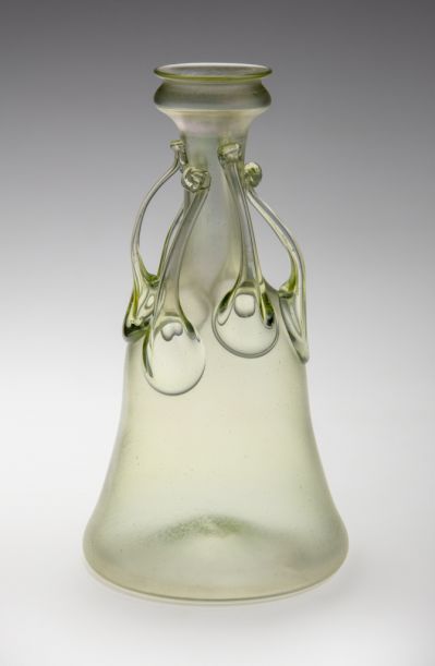 The elongated, bell-shaped body has a circular base there are six hollow extensions applied while hot to the top of the body, close to the neck. The extensions enclose the long neck, which ends in a short, splaying top rim, supported by a ring. The simple bottle of Egyptian origin is decorated with extensions resembling to the so-called trunk bottles (Rüsselbecher), a French type fairly common in the 5th-7th century. The whole surface of the bottle is iridescent.