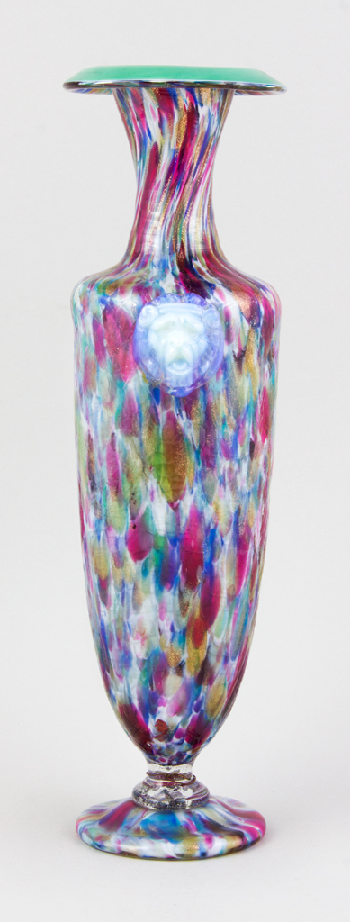 The broad foot rises conically in the middle, supporting the sugar-shaped body. There are moulded lion masks on both sides where the long, gradually tapering neck starts. It ends in a splaying top rim. The whole surface of the vase is decorated with red, turquoise, green, opaque white and cop-per aventurine threads and spots. The top rim is opaque green the lion masks are bluish and opaque. The form of the vase is classical, the decoration, the colours and the moulded masks use the traditions of Renaissance glass art in Venice-Murano.