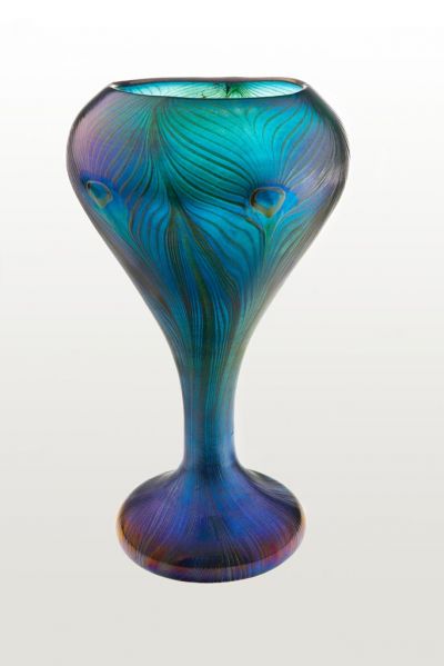In 1898, the Director of the Museum of Applied Arts, Jenő Radisics (1856–1917) held an international exhibition entitled The Modern Art to present new developments in the contemporary art of the time. It included fifty items by Louis Comfort Tiffany (1848–1933). Prior to the Budapest exhibition, Tiffany had shown his art glass in Vienna. Siegfried Bing (1838–1905) – Tiffany’s sole distributor in Europe – wanted to avoid the embarrassment of an exhibition in Budapest featuring only pieces that Vienna customers did not want. He therefore added pieces of equivalent standard from his Paris shop La Maison de l’Art Nouveau to the Budapest exhibits. Tiffany was thus represented by a diverse set of top-quality glassware. The catalogue stated that several pieces were actually made for the exhibition. The Peacock vase was one of several other Tiffany items which the Museum of Applied Arts actually purchased. The vase displays the true shimmering blue and green tones of the bird’s feathers. The aventurine filaments placed on the blown cobalt blue base when it was still hot melted into the glass upon further heating, giving the effect of sweeping brushstrokes. The production process responsible for the Peacock vase was developed by George J. Cook, under Tiffany’s personal supervision. In an article published in 1898, Siegfried Bing wrote that Tiffany was so captivated by the peacock-feather motif that he conducted experiments for a whole year in search of a way of emulating the iridescent beauty of that magnificent bird’s plumage. His efforts gave rise to a great many Peacock vases, no two of which are alike. On the Budapest piece, the combination of refined precision with nonchalant vigour attests to virtuosity of the technique applied with a sure touch, and betrays no sign of experimental uncertainty. The vase is the embodiment of technical perfection and artistic refinement.