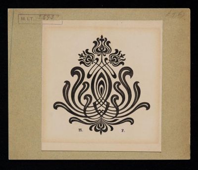 The source of Ferenc Helbing's early designs is the folklore: following József Huszka he mainly preferred the stylized rose, the so-called "plumet of peacock" motif and other floral ornaments, thought to be the most ancient and Hungarian among the varied motifs. Sometimes, the crossings and continuity of the lines recalls the frogs-and-loops and other string decoration of Hungarian gala folklore clothing.