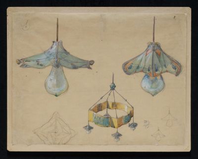 Darilek designed a chandelier of metal, probably brass. The basic geometrical shape is created of plates connected in a square. Each side consists of curved rectangles, flanked by squares. The rectangles are enriched with sitting female figures. The elements on the drawing are turquoise, with a reference to enamel painting. The hanger chain starts from the corners of the chandelier, connected in the centre in a rich ornament. The four shades are also hung up, fixed to the corners. Their light,