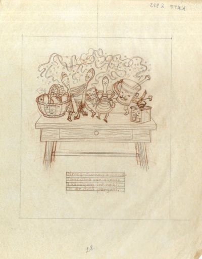 This piece is a fine example of harmonizing the work of the poet and that of the graphic designer. Erzsi Gazdag specifically asked her publisher to employ Kató Lukáts as the illustrator of her works. Our collection holds all illustration designs for this volume. Along with the images, the artist was also responsible for the complete graphic design, from the fonts and layout to the title page and cover. This drawing exemplifies her elegant style, which is always a perfect match for the text.