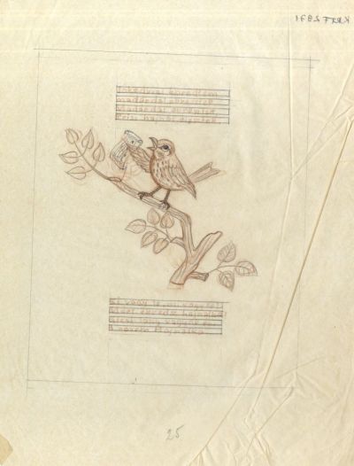 This piece is a fine example of harmonizing the work of the poet and that of the graphic designer. Erzsi Gazdag specifically asked her publisher to employ Kató Lukáts as the illustrator of her works. Our collection holds all illustration designs for this volume. Along with the images, the artist was also responsible for the complete graphic design, from the fonts and layout to the title page and cover. This drawing exemplifies her elegant style, which is always a perfect match for the text.